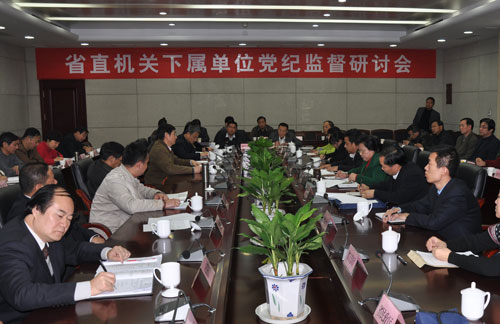 为深入学习贯彻落实胡锦涛总书记“七一”讲话精神和中省纪委六次全会精神,研究探讨新形势下深化廉政风险防控制度建设的方法与措施,11月25日,省直机关下属单位党纪监督研讨会在省委1号办公楼召开,52个省直部门机关党委负责同志及下属单位负责人参加了会议。省直机关工委副书记张小文、省纪委党风室主任魏建国出席会议并讲话,会议由省直机关纪工委副书记石军利主持。
