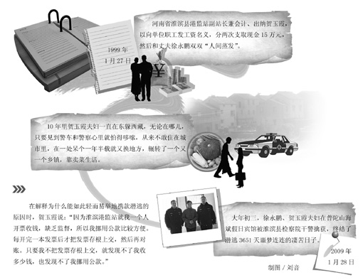 10年前,河南省淮滨县港监站副站长兼会计、出纳贺玉霞,以向单位职工发工资的名义,分两次支取现金15万元,然后和丈夫徐永鹏双双“人间蒸发”。