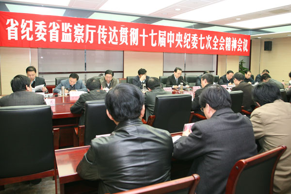 1月11日下午,省纪委省监察厅召开常委扩大会议,学习传达第十七届中央纪委第七次全会精神。省委常委、省纪委书记郭永平强调,认真学习领会全会精神,把思想和行动统一到胡锦涛总书记重要讲话和中央纪委七次全会精神上来,抓好中央纪委七次全会部署的各项任务落实。