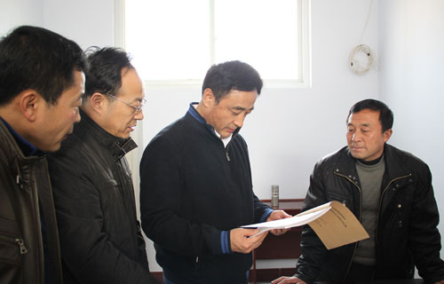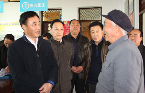 马奔在岐山县双桥村检查村民监督委员会制度落实情况并与监委会主任亲切交谈。宝鸡市纪委书记田筱虎、岐山县县委书记张海建陪同检查。