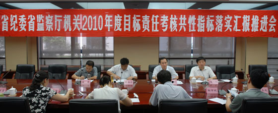 9月17日,省纪委机关(省监察厅)召开2010年度目标责任考核共性指标落实汇报推进会。省纪委副书记纪相忠在会上作了讲话,对做好共性指标任务的落实提出了具体要求;省纪委常委郭润芝主持会议并对贯彻落实会议精神提出要求;省纪委常委高霄参加会议。承担共性指标任务的相关室处单位负责同志根据《委厅机关2010年度领导班子建设和反腐倡廉建设指标分解表》分解的有关任务逐条对照汇报落实进展情况。