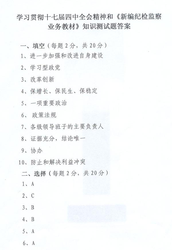 全省纪检监察系统学习贯彻十七届四中全会精神和《新编纪检监察业务教材》知识测试题答案
