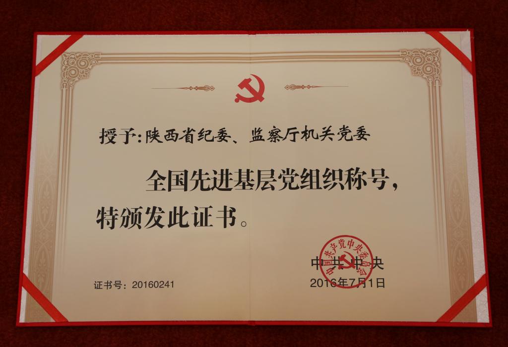 陕西省纪委、监察厅机关党委被中央授予“全国先进基层党组织”荣誉称号
