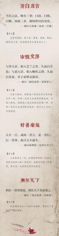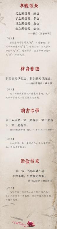 中华传统家规家训虽然内容十分丰富,涉及的领域极其广泛,但核心内涵始终为“孝悌忠信礼义廉耻”这八个字,敬祖宗、孝父母、爱国家、勤耕读、勉读书、尚廉洁、敦善行、慎交游等是其中的高频词。家规中的不少名句,流传千古,脍炙人口。