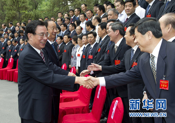 中共中央政治局常委、中央纪委书记贺国强出席会议并讲话。这是贺国强在会前接见与会人员。