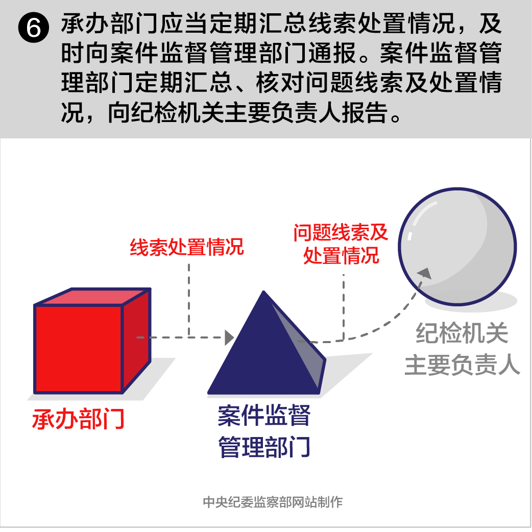 第十七条承办部门应当定期汇总线索处置情况,及时向案件监督管理部门通报。案件监督管理部门定期汇总、核对问题线索及处置情况,向纪检机关主要负责人报告。