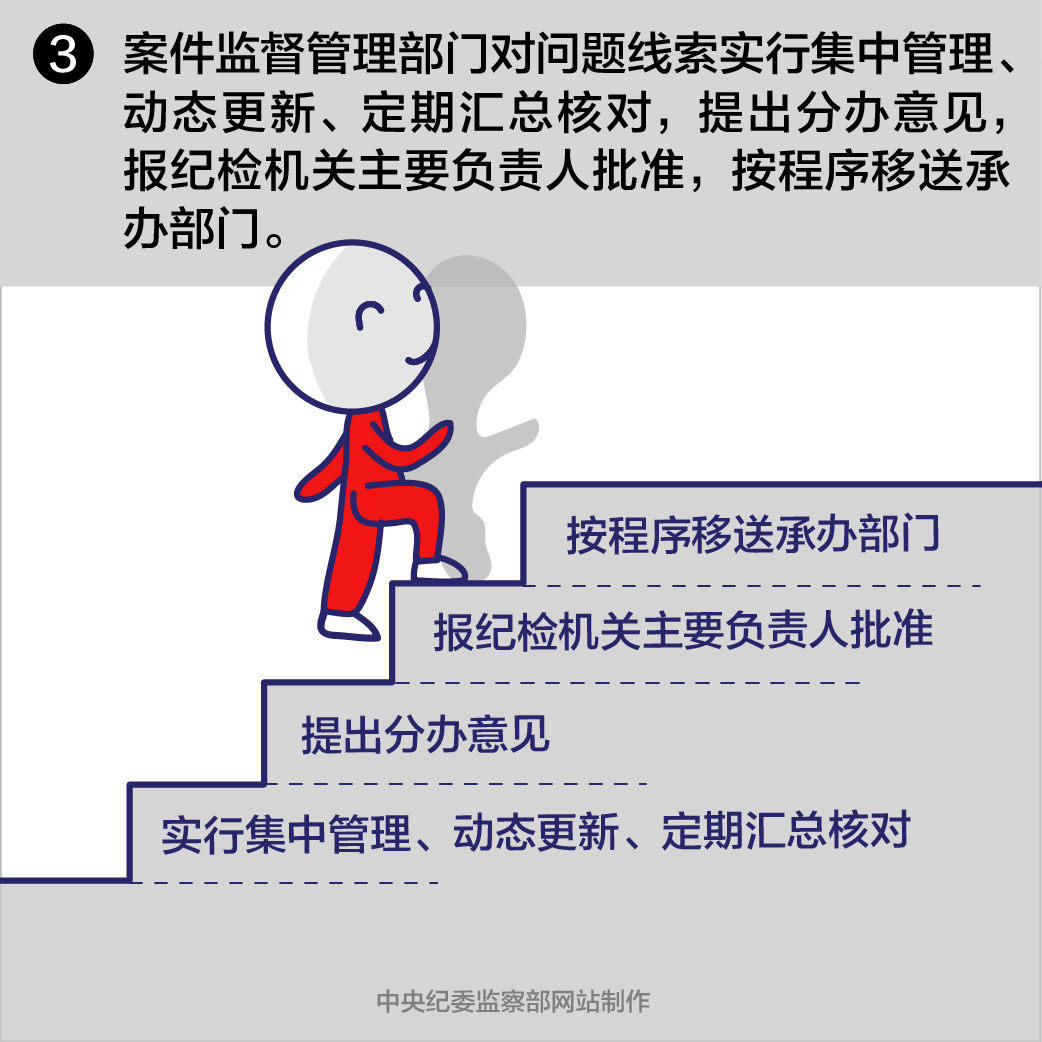 第十四条案件监督管理部门对问题线索实行集中管理、动态更新、定期汇总核对,提出分办意见,报纪检机关主要负责人批准,按程序移送承办部门。承办部门应当指定专人负责管理问题线索,逐件编号登记、建立管理台账。线索管理处置各环节均须由经手人员签名,全程登记备查。