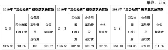 2011年监察部“三公经费”财政拨款预算1254.40万元,其中:因公出国(境)费504.06万元(零增长),公务用车购置及运行费439.28万元(较2010年压缩9.98%),公务接待费311.06万元(较2010年压缩0.89%)。