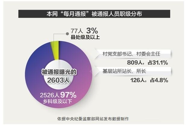 在本网“每月通报”曝光的2603人中,县处级及以上人员77人,占3%;乡科级及以下2526人,占97%。村党支部书记、村委会主任809人,占总人数31.1%,基层站所站长、所长126人,占总人数4.8%。