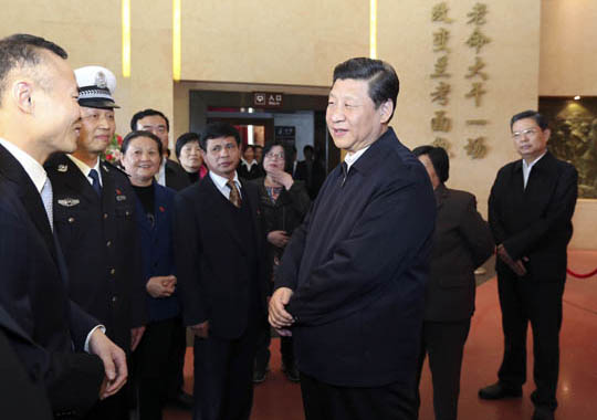 3月17日至18日,中共中央总书记、国家主席、中央军委主席习近平在河南省兰考县调研指导党的群众路线教育实践活动。这是3月17日,习近平在参观焦裕禄同志纪念馆时同焦裕禄亲属和基层模范干部代表亲切交流。新华社记者 丁林 摄