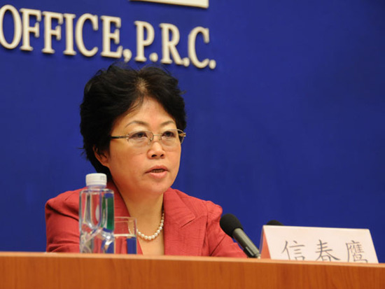 国务院新闻办公室于2009年9月22日(星期二)上午10时举行新闻发布会,请全国人大常委会法工委副主任信春鹰和国务院法制办副主任袁曙宏介绍新中国60年法治建设成就等方面情况,并回答记者提问。图为全国人大常委会法工委副主任信春鹰回答记者提问。