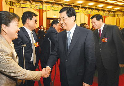 三月四日,中共中央总书记、国家主席、中央军委主席胡锦涛看望出席全国政协十一届五次会议的医药卫生界、社会福利和社会保障界委员并参加联组讨论。中共中央政治局常委、全国政协主席贾庆林参加了看望和讨论。新华社记者 兰红光摄