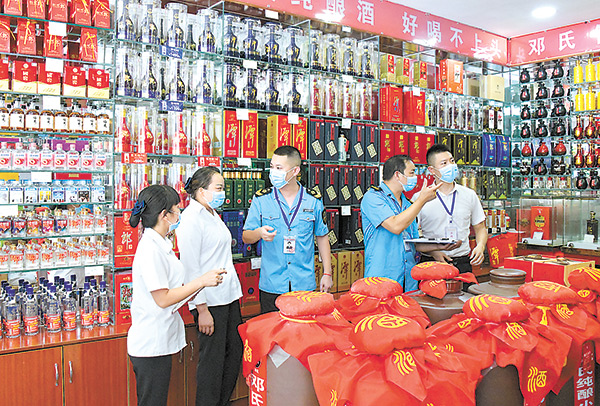 中秋、国庆来临,四川省泸州市古蔺县纪委监委联合市场监管等部门,深入各大超市、商场,对违规收送礼品礼金等问题进行察访,严防“四风”隐形变异、反弹回潮。图为该县纪检监察干部在某烟酒店摸排问题线索。苏海鹏 摄