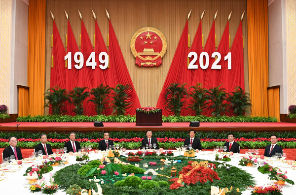 中央党政军群有关部门负责人,各民主党派、全国工商联负责人和无党派人士代表,北京市负责人,功勋荣誉获得者代表、全国“两优一先”表彰对象代表,东京奥运会、残奥会中国体育代表团代表,全国劳动模范和先进人物代表,为民族地区稳定、发展、团结作出重要贡献的少数民族代表人士,在京的部分香港特区人士、澳门特区人士、台湾同胞和华侨、华人代表,各国驻华使节、各国际组织驻华代表、部分外国专家也出席了招待会。