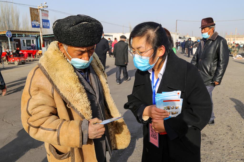 在新疆维吾尔自治区轮台县艾尔凡市场的流动接访现场,纪检监察干部们冒着严寒,引导群众参与供热领域问题集中整治调查问卷,并向来往群众发放纪检监察信访举报指南,鼓励群众积极举报漠视侵害群众利益的问题线索。(新疆维吾尔自治区轮台县纪委监委供 张越 摄)