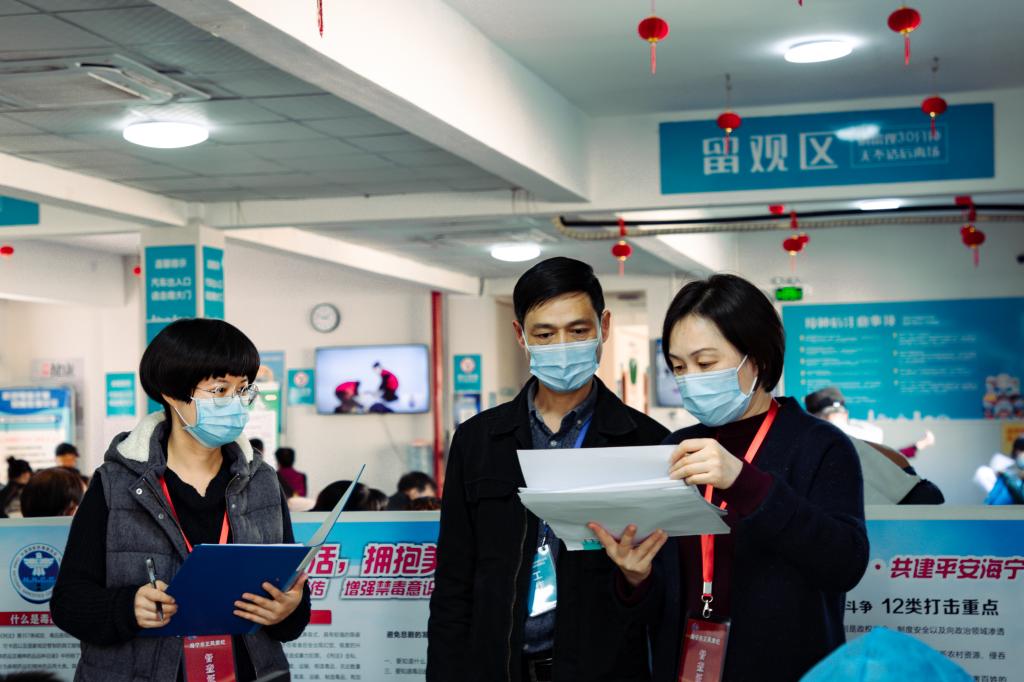 在疫情防控中,浙江省海宁市纪检监察干部深入基层各地、防疫检查点、医院、疫苗接种点等,对防疫措施落实情况进行督查。图为该市海洲街道纪检干部对疫苗接种点防疫措施落实情况进行检查。(浙江省海宁市纪委监委供 姚雯楠 摄)