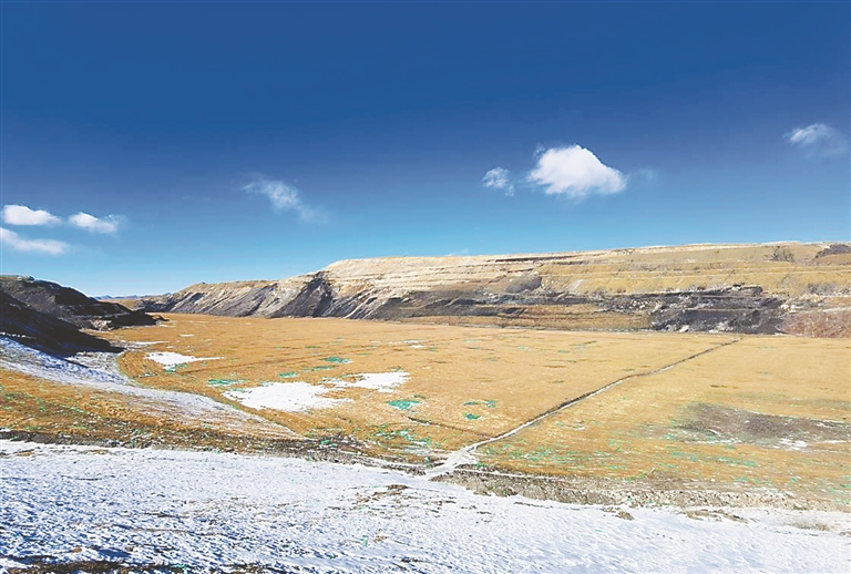 青海木里矿区非法采煤问题查处后,青海省以案为鉴、扛起生态文明建设政治责任,开展木里矿区以及祁连山南麓青海片区生态环境综合整治三年行动。图为2021年11月,复绿后的木里矿区江仓1号。 (图片来源:人民网)