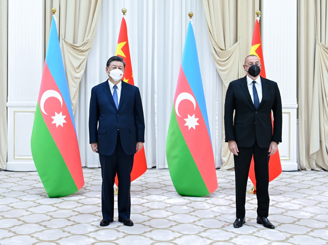 当地时间15日下午,国家主席习近平在撒马尔罕国宾馆会见阿塞拜疆总统阿利耶夫。