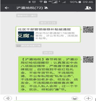 “春节将至,浐灞分局纪检组提醒您:认真落实中央八项规定精神,严格遵守廉洁自律规定,自觉做到不收红包礼金、不收年货节礼、不违规吃请、不公车私用或私车公养、不违规参加老乡会战友会校友会……”2016年以来,西安市地方税务局浐灞生态区分局积极借助新媒体,运用“微信群”打造党风廉政宣传教育新型载体,把廉政教育“大课堂”融入“小平台”,营造“廉政知识随时学、廉洁动态时刻知、宣廉倡廉相伴行”的浓厚氛围,时刻警醒广大税务干部抵住诱惑、守住防线、筑牢廉政“防火墙”。