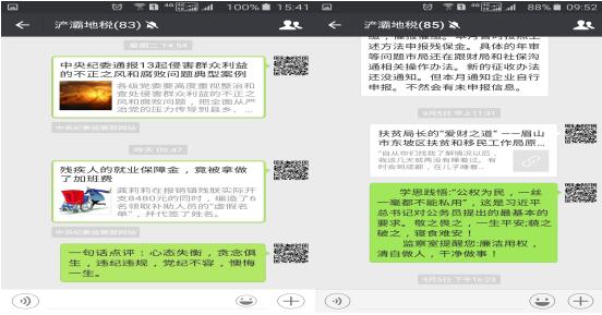 随着智能手机普及和微信平台的广泛应用,微信已成为生活中不可或缺的交流工具,也成为人们获知外来信息的重要载体。分局充分利用微信平台传播迅捷、受众面广、互动性强、认同度高等特点,创建“浐灞地税”微信群,定期向分局干部职工发送党纪法规、提醒短信、反腐动态、案例通报等信息,提醒广大党员干部警钟长鸣,“动动手指滑滑屏”就可以接受生动形象的“指尖上的廉政教育”,实现了廉政教育常态化、廉政警示动态化、廉政信息生活化。