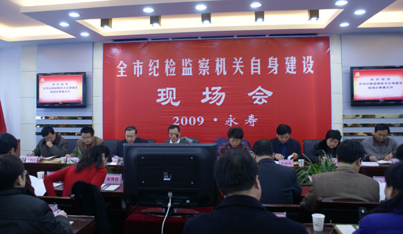 为了认真贯彻落实党的十七届四中全会精神和中纪委9、10号文件要求,进一步推动纪检监察机关自身建设,为反腐倡廉工作提供有力保证,11月30日,咸阳市纪委监察局在永寿县召开了全市纪委监察局机关自身建设现场会。参会人员观摩了永寿县纪检监察局机关自身建设的资料、图片、版面、设施及办公环境,永寿县委书记庞少波致辞,永寿县委常委、纪委书记王旭同志介绍了经验,市委常委、纪委书记张秀英同志作了重要讲话。