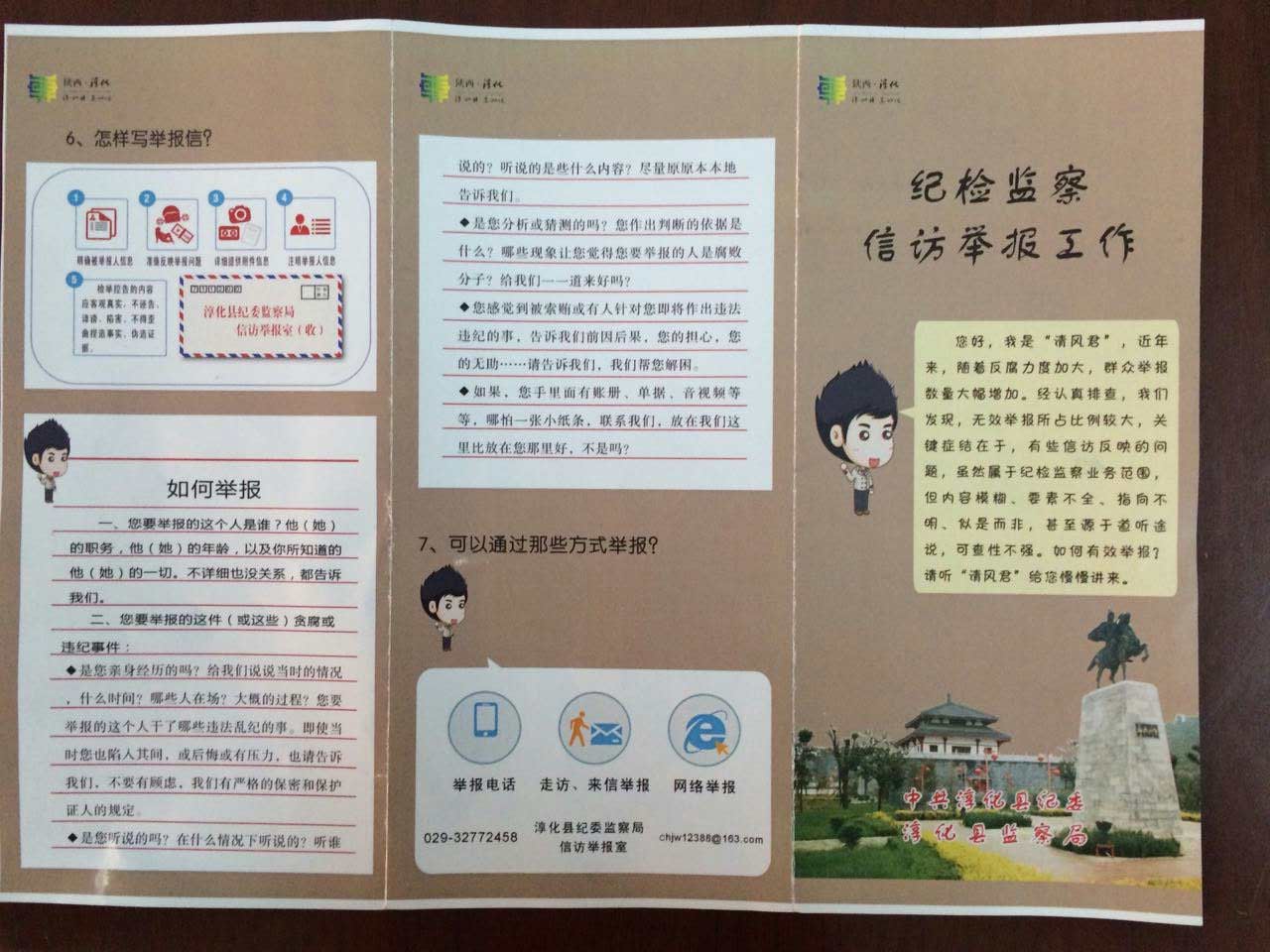 为了解决这一问题,淳化纪委创新思路,近期特别制作了《纪检监察信访举报宣传册》,以照片、图表、文字等形式,详细讲解纪检监察机关受理举报的范围、对象和流程,对于纪检监察机关受理范围外的问题,也列出了受理部门及联系方式,引导群众有序信访。