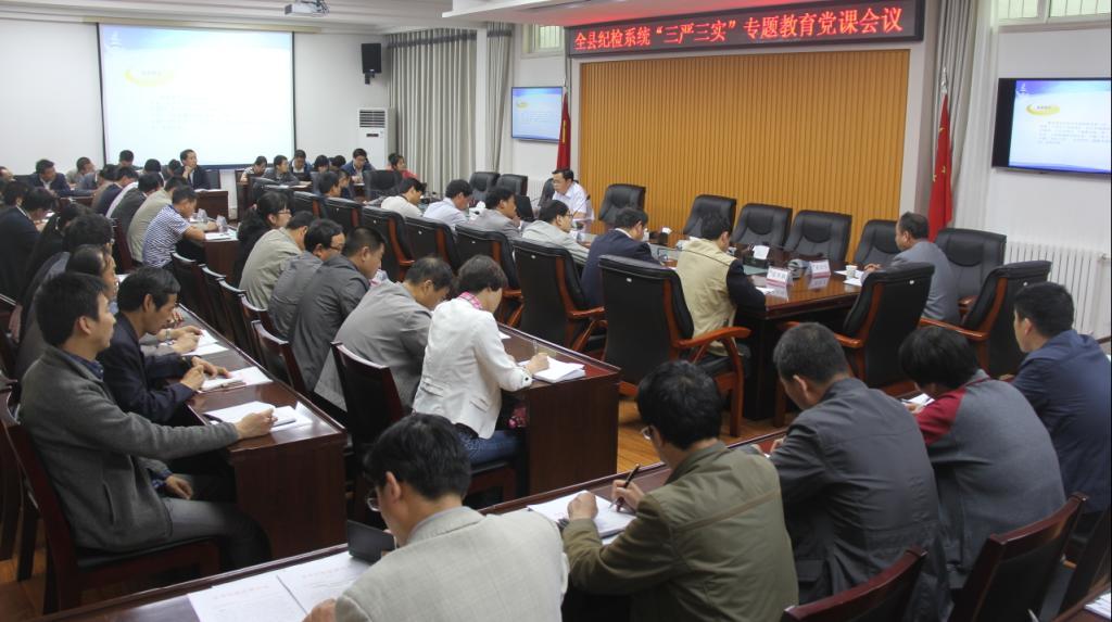胡江涛结合学习贯彻习近平总书记系列重要讲话精神、中省市县“三严三实”专题教育工作有关要求、中纪委十八届五次全会精神及全县纪检监察干部队伍实际,重点从“三严三实”的丰富内涵,重大意义,“不严不实”的表现、危害及纪检监察干部践行“三严三实”的基本要求等四个方面为全县纪检监察干部作了清晰透彻、意味深远、深入浅出的讲授。