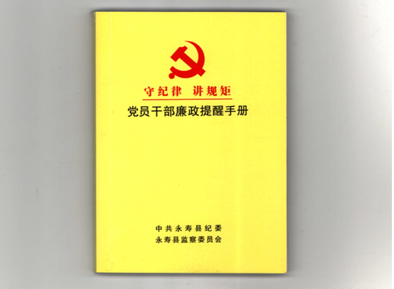 近日,为进一步加强党员廉洁教育,深入学习贯彻党的十九大精神,永寿县纪委结合基层党员干部特点,设计制作了通俗易懂、内容丰富的《守纪律、讲规矩——党员干部廉政提醒手册》,方便党员干部随时随处“照镜子正衣冠”,明确行为边界,谨防身边陷阱,严守纪律底线,不碰党纪红线。