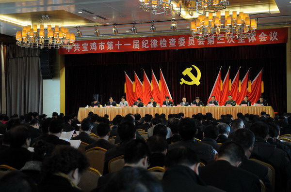 2月17日下午,中国共产党宝鸡市第十一届纪律检查委员会召开第三次全体会议。宝鸡市委书记唐俊昌出席会议并作重要讲话。唐俊昌强调,各级党委要把反腐倡廉建设摆在更加突出的位置,坚持从严治党,坚持惩防并举,继续全面推进惩防体系建设,不断提高反腐倡廉建设科学化水平,确保全市反腐倡廉建设取得新成效,为宝鸡经济社会发展积聚正能量,为打造关天副中心、建设和谐新宝鸡、实现“六个走在前列”提供坚强政治保障。