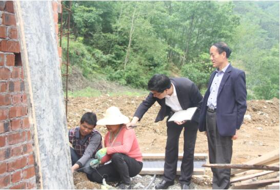9点50分,付家安和村支书一起到3组查看“交钥匙”安居工程修建情况。付家安一边询问工程进展情况,一边叮嘱工人们千万注意安全。交通村共2处正在修建的“交钥匙”安居工程,这一处今年1月开工,计划7月交工,建成后将解决8户12人贫困对象的住房问题。