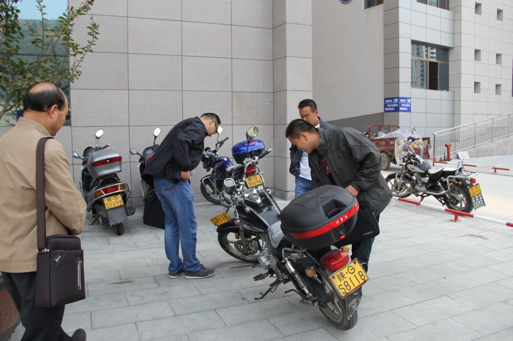 图片二:上午8:30,因为今天要到村组入户调查取证,期间多是未硬化的乡村小路,办案人员选择摩托车作为交通工具。
