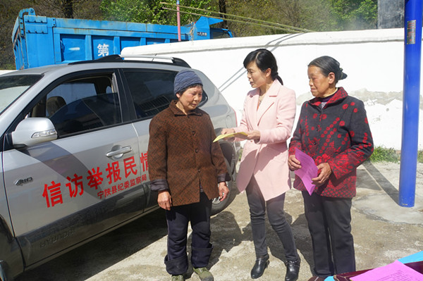 图三、9:40,贴有“信访举报民情直通车”字样的公务车抵达月河坪村活动室,周围的群众聚集过来。万保侠和同事稍作整理,开始给大家发宣传资料。