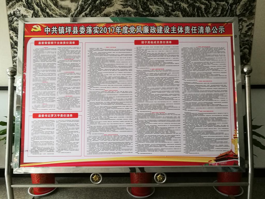 3月15日起,中共镇坪县委首次将《中共镇坪县委落实2017年度党风廉政建设主体责任清单》全文,采取在县政府网站、县纪委党风廉政网站、县委组织部的党建网站和县委大楼党务公开栏进行公示,带头向全社会晒出了县委班子主体责任清单。