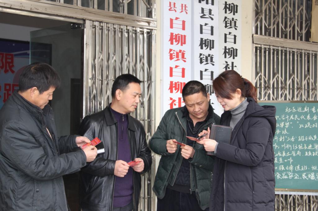图为该县白柳镇干部向镇社区、村组干部发放学习“明白卡”