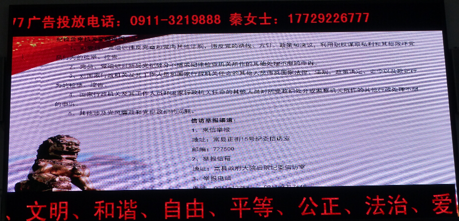为方便群众监督举报,近日,富县纪委在火车站、县体育场、电视台等人流量大、关注率高的地方,通过大型LED显示屏及媒体向广大群众公布县纪委信访举报受理范围、举报方式。