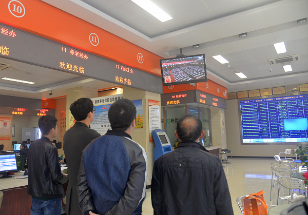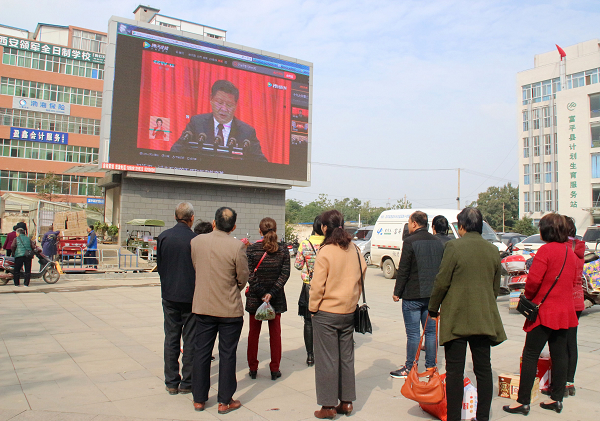 富平县便民服务中心广场,群众观看十九大开幕式。(长瑜瑾摄)