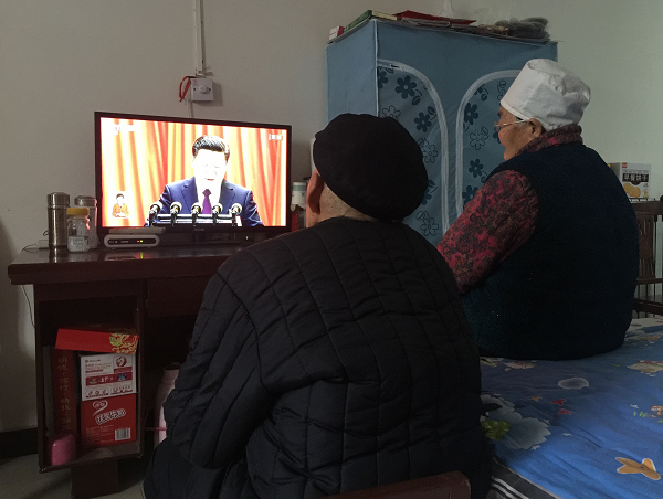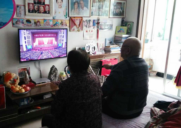 党的十九大上午九时开幕,年已九十的老爸和年近九十的老妈早早守在电视机前,聆听习近平总书记做报告。老爸是1957年入党的老党员。他见证了我党建国后的改革建设,老人对党的情感无与伦比,他不时地把电视声音调大,一字一句聆听总书记报告!(合阳县卫计局 赵晓罡摄)