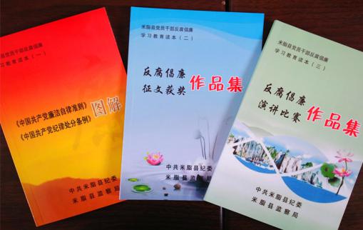 编印《反腐倡廉演讲比赛作品集》。该县纪委举办了“清风颂”反腐倡廉演讲比赛。参加决赛的是由县文广局、县教育局和县公安局等单位经过层层选拨、脱颖而出的23名优秀选手。比赛中选手们结合自身工作实际,从不同层面、不同角度,以真挚的情感,独到的见解,诠释了“立足工作岗位、恪守从政道德、保持党的纯洁性”的重要性,比赛紧扣廉洁主题,用生动的人和事,感人的情和景,弘扬了爱岗敬业、求真务实,为民服务,秉公用权,无私奉献的精神,唱响主旋律,激发正能量。该县纪委将23名优秀选手的演讲稿及冯曰恕等米脂10位历代清官廉吏故事整理编印成册,作为全县党员干部反腐倡廉学习教育读本。