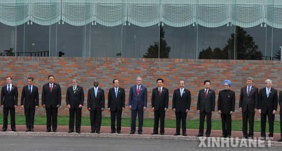 7月9日,国家主席胡锦涛在日本北海道洞爷湖出席八国集团同发展中国家等领导人对话会议。这是领导人集体合影。