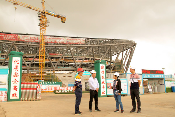 海口市纪委监委对公共工程和土地出让项目跟踪监督,全流程、嵌入式防控廉洁风险。图为该市纪检监察干部在海口市西海岸五源河体育馆二期项目了解相关情况。吉曼妮 摄