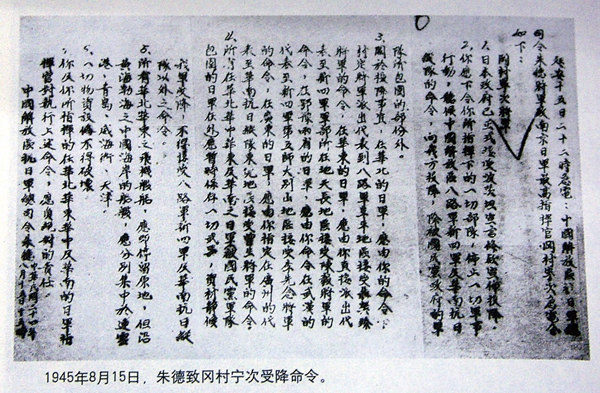 1945年8月15日,日本天皇裕仁以广播形式发布《终战诏书》。日本无条件投降。图为当日,朱德总司令致侵华日军总司令冈村宁次的受降命令。 (图片来源:人民视觉)
