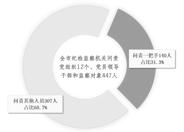 查处问责力度持续加大。严明政治纪律和政治规矩,查处案件首先从政治纪律查起,严肃查处秀山土家族苗族自治县委原书记王杰贯彻落实脱贫攻坚、中央生态环保督察整改等党中央重大决策部署打折扣、搞变通,永川区公安局原局长简小雨推进扫黑除恶专项斗争不力等典型案件。严肃追责问责,对贯彻落实党中央重大决策部署失职失责的,既追究直接责任人责任,又追究领导责任,严肃追究落实统筹发展和安全重大决策部署不力的相关责任人责任,加大环保领域问责力度。