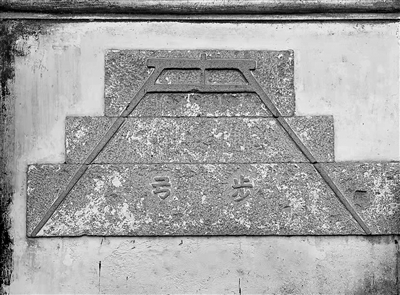 “三公祠”占地面积252平方米,祠中有思泉亭、学海书院、望月楼、致斋所、衍庆道院,设遗爱堂,列三公像,岁时瞻拜。遗爱堂外的西墙上,镶嵌有三块叠置的条石,一支“步弓”镌刻其上。步弓是古代丈量田亩的器具,形似圆规,呈“大”字形,两足通高92厘米,肩宽53.5厘米,两足长107厘米,两足间距171厘米。这块“步弓石”是当年为校准步弓尺寸而特制的器具,全国罕见。