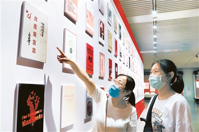 2021年8月5日,北京,观众在国家图书馆观看展出的不同版本的《共产党宣言》。(图片来源:人民视觉)