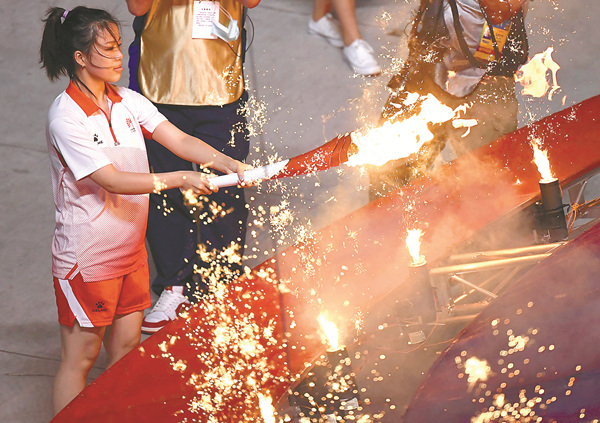 9月15日,第十四届全国运动会开幕式在西安奥体中心体育场举行。图为火炬手杨倩点燃主火炬。 新华社记者 薛宇舸 摄