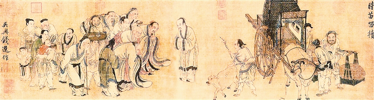 “时苗留犊”是古代清官的典范。时苗是东汉人,曾任寿春令,上任时乘母牛驾的车,后牛生一犊,时苗离任时将牛犊留下,不肯带走。比喻为官清廉。图为宋元时期画家钱选所绘《时苗留犊图》(局部)。(资料图片)