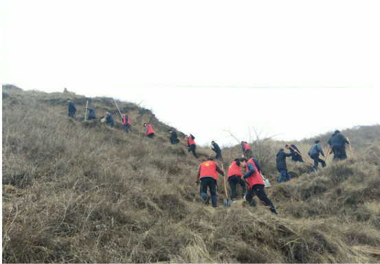图为彬州市纪委监委班子领导带头在荒坡上翻土挖坑