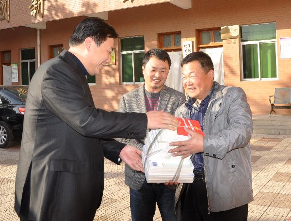 近日,陕西省渭南市组织十八大精神宣讲队结合农村实际,走村入户向基层党员干部和群众宣讲十八大精神并赠送相关学习资料。图为该市纪委、监察局干部向蒲城县城关镇古镇社区干部赠送学习资料。
