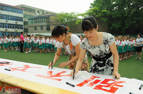 近日,陕西省渭南市深入开展师德师风整顿活动,通过健全师德档案,把教师职业道德表现与行政奖惩、职务晋升、职称评聘、竞争上岗等挂钩,规定对师德不合格、严重违反教师职业道德规范的,取消教师资格;对严重违反教师职业道德并造成恶劣后果的,依法提交司法机关追究法律责任;师德师风方面出现问题的学校,一律不得参加任何评优活动,同时严肃追究校长责任。截止目前,该市已对违规补课、乱收资料费的4名教师进行了处理,并对2名校长进行了问责。图为新学期伊始,临渭区北塘实验小学教师签名承诺“告别不文明行为,树廉洁从教新风”。