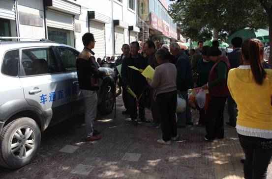 陕西省靖边县纪委、监察局畅通信访举报渠道,开通了信访举报民情直通车,走进各乡镇、社区和机关宣传并接访。图为11月18日,该县信访举报民情直通车走进东坑镇,纪检监察干部向群众发放宣传单。